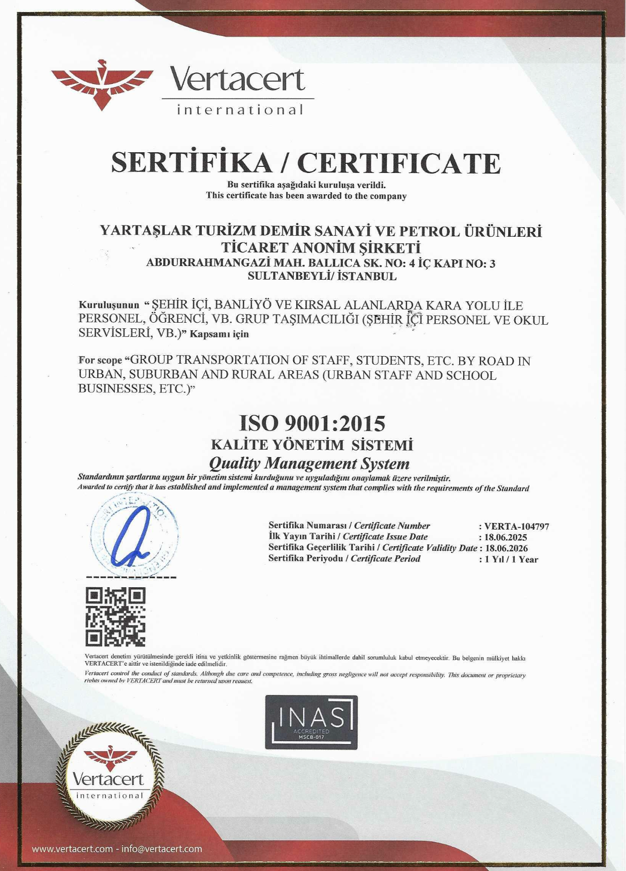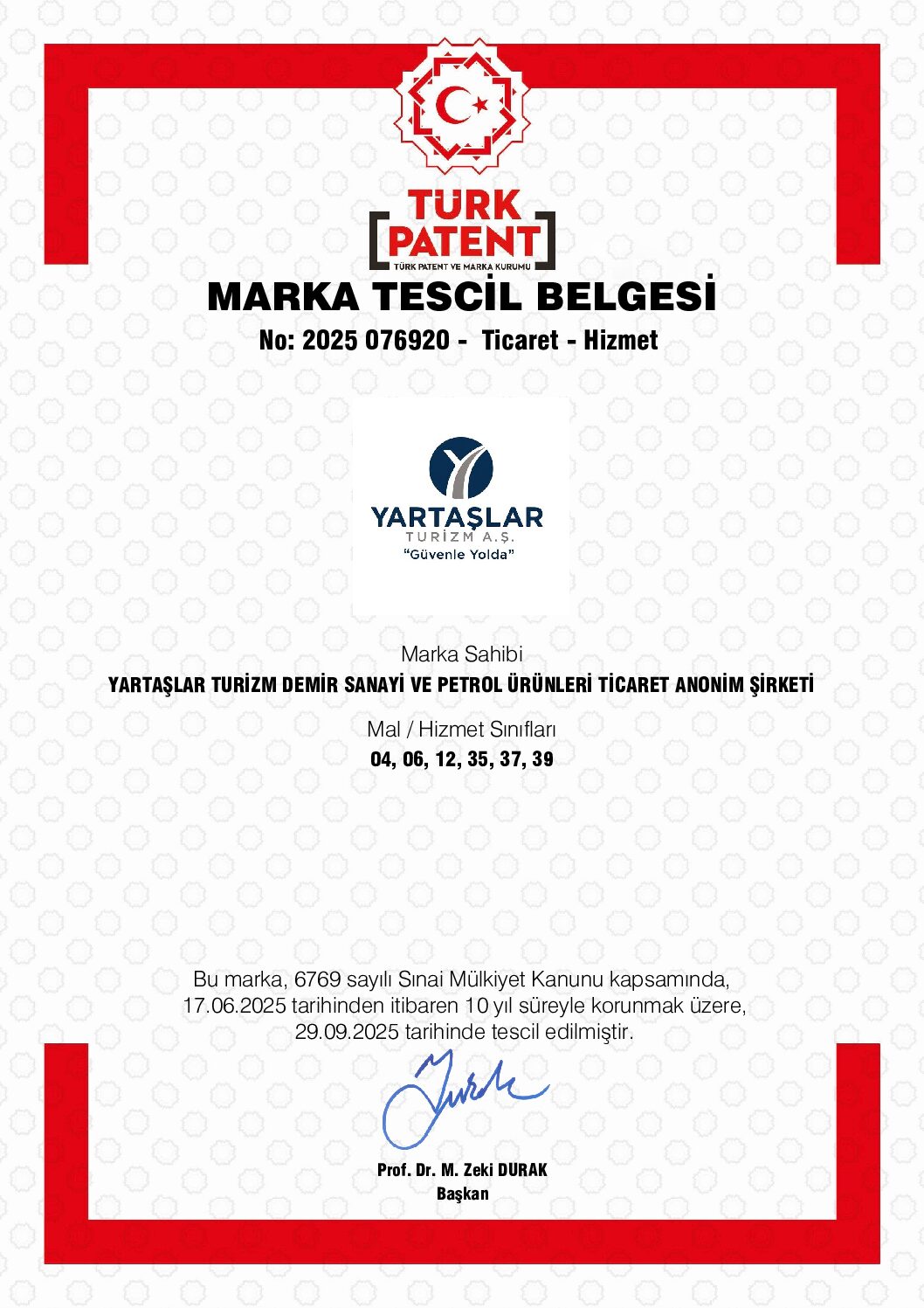 Ulaşım sektöründeki bu tecrübe, bizi daha profesyonel ve kurumsal bir yapıya yönlendirmiş; uzun yıllar Kırmızı Beyaz Turizm çatısı altında görev almış olan deneyimli kadromuz ile birlikte, artık kendi markamız olan Yartaşlar Turizm A.Ş. adı altında yeni bir yolculuğa çıkmamıza vesile olmuştur.
